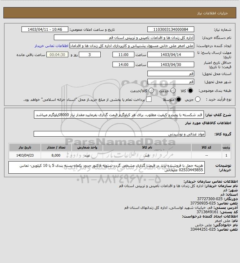 شرح کلی نیاز: قند شکسته با پخت و کیفیت مطلوب، برای هر کیلوگرم قیمت گذاری بفرمایید-مقدار نیاز 8000کیلوگرم میباشد