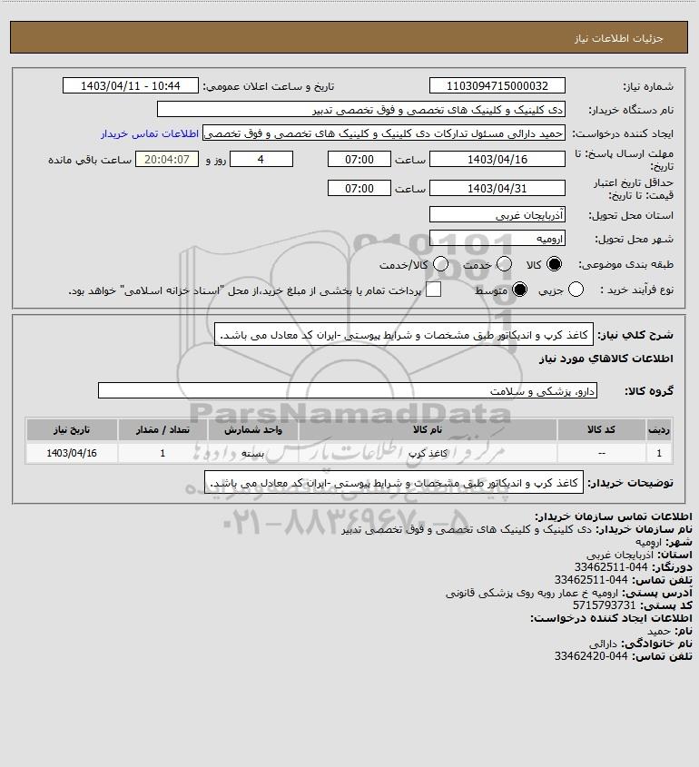 شرح کلی نیاز: کاغذ کرپ و اندیکاتور طبق مشخصات و شرایط پیوستی -ایران کد معادل می باشد.