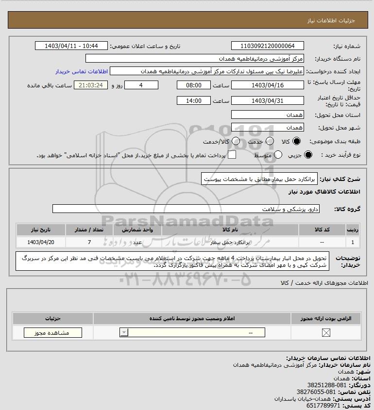 | 1 | -- | برانکارد حمل بیمار | عدد | 7 | 1403/04/20 |