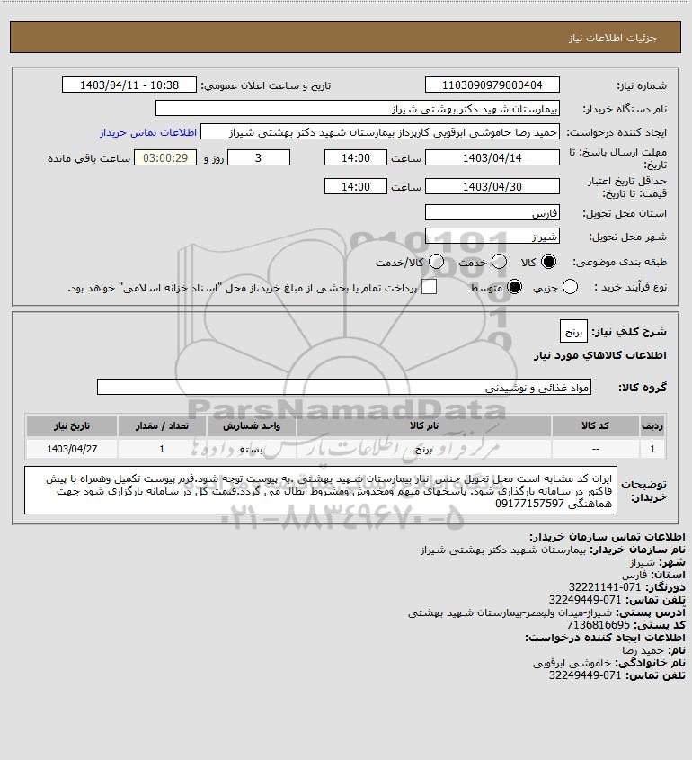 نام سازمان خریدار: بیمارستان شهید دکتر بهشتی شیراز