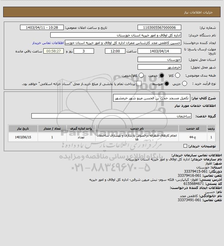 شرح کلی نیاز: تکمیل مسجد حجت بن الحسن مینو شهر خرمشهر