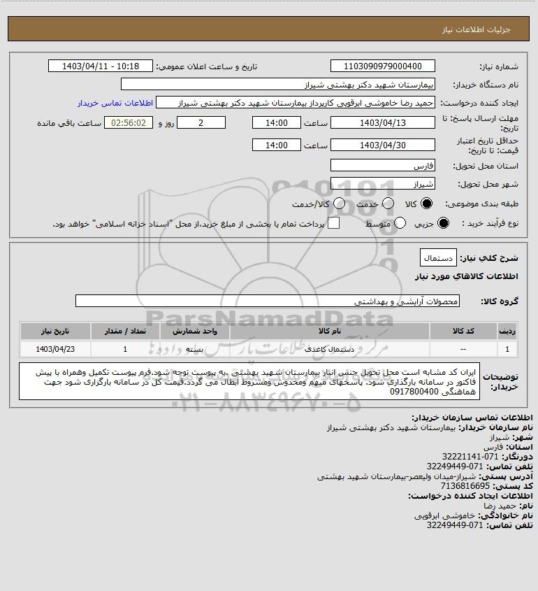 نام دستگاه خریدار:بیمارستان شهید دکتر بهشتی شیراز