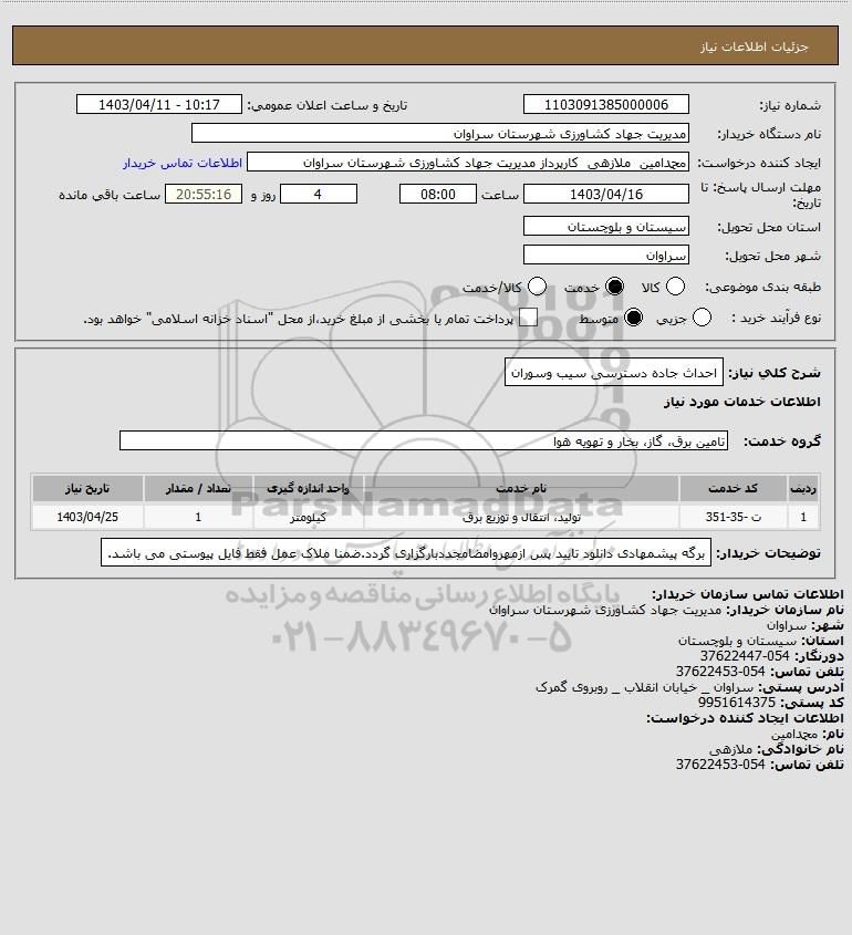 شرح کلی نیاز: احداث جاده دسترسی سیب وسوران