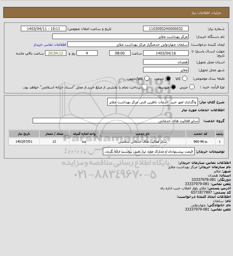 شرح کلی نیاز: واگذاری امور خرید خدمات ناظرین فنی مرکز بهداشت ملایر