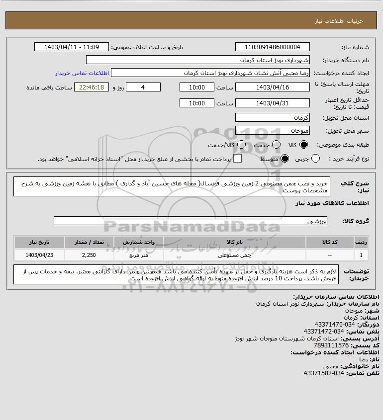 شرح کلی نیاز: خرید و نصب چمن مصنوعی 2 زمین ورزشی فوتسال( محله های حسین آباد و گداری ) مطابق با نقشه زمین ورزشی به شرح مشخصات پیوست