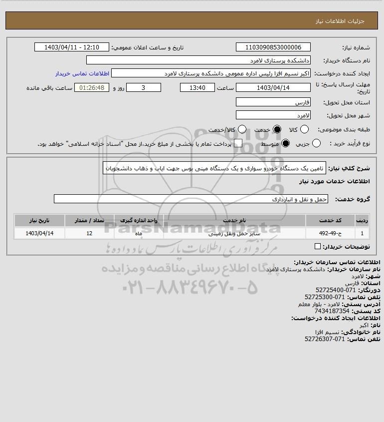 شرح کلی نیاز: تامین یک دستگاه خودرو سواری و یک دستگاه مینی بوس جهت ایاب و ذهاب دانشجویان