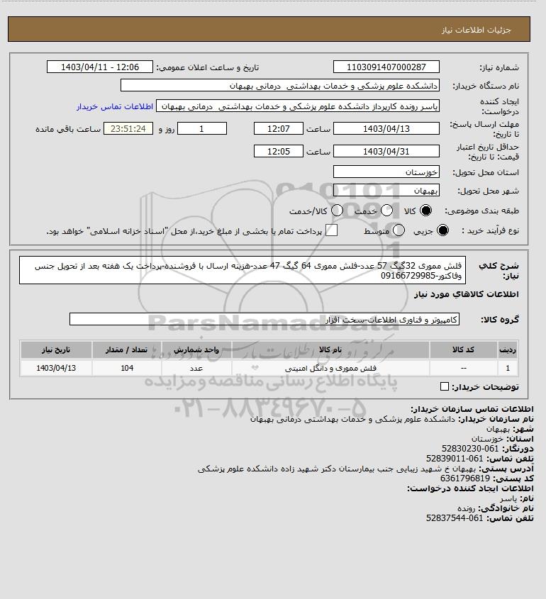 شرح کلی نیاز: فلش مموری 32گیگ 57 عدد-فلش مموری 64 گیگ 47 عدد-هزینه ارسال با فروشنده-پرداخت یک هفته بعد از تحویل جنس وفاکتور-09166729985