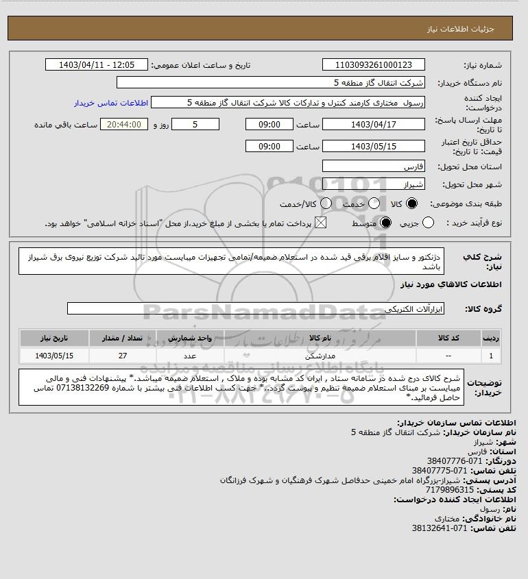 شرح کلی نیاز: دژنکتور و سایز اقلام برقی قید شده در استعلام ضمیمه/تمامی تجهیزات میبایست مورد تائید شرکت توزیع نیروی برق شیراز باشد