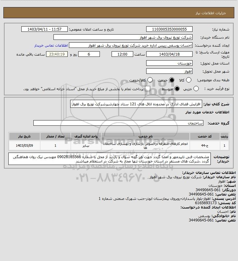 شرح کلی نیاز: افزایش فضای اداری در محدوده اتاق های 121 ستاد چهارشیرشرکت توزیع برق اهواز
