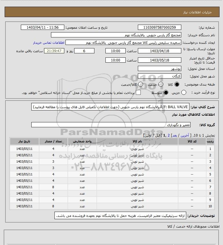 نام دستگاه خریدار:مجتمع گاز پارس جنوبی پالایشگاه نهم