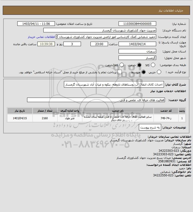 شرح کلی نیاز: احداث کانال انتقال آب روستاهای ناروهه، بنکوه و غیاث آباد شهرستان گرمسار