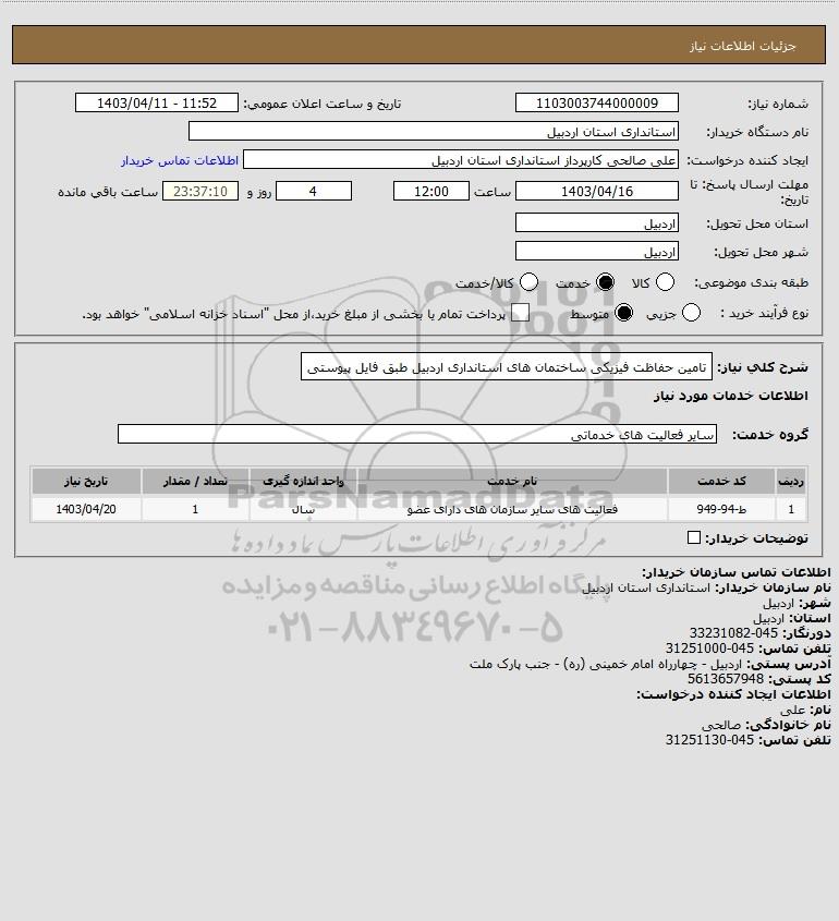شرح کلی نیاز: تامین حفاظت فیزیکی ساختمان های استانداری اردبیل طبق فایل پیوستی