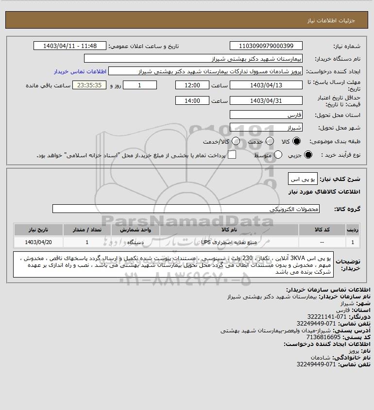 نام سازمان خریدار: بیمارستان شهید دکتر بهشتی شیراز