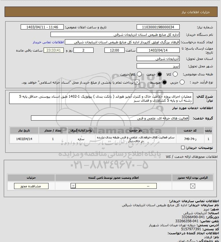 شرح کلی نیاز: عملیات اجرای پروژه حفاظت خاک و کنترل آبخیز هوراند ( بانکت بندی ) بیولوژیک 1-1402 طبق استاد پیوستی حداقل پایه 5 رشته آب و پایه 5 کشاورزی و فضای سبز
