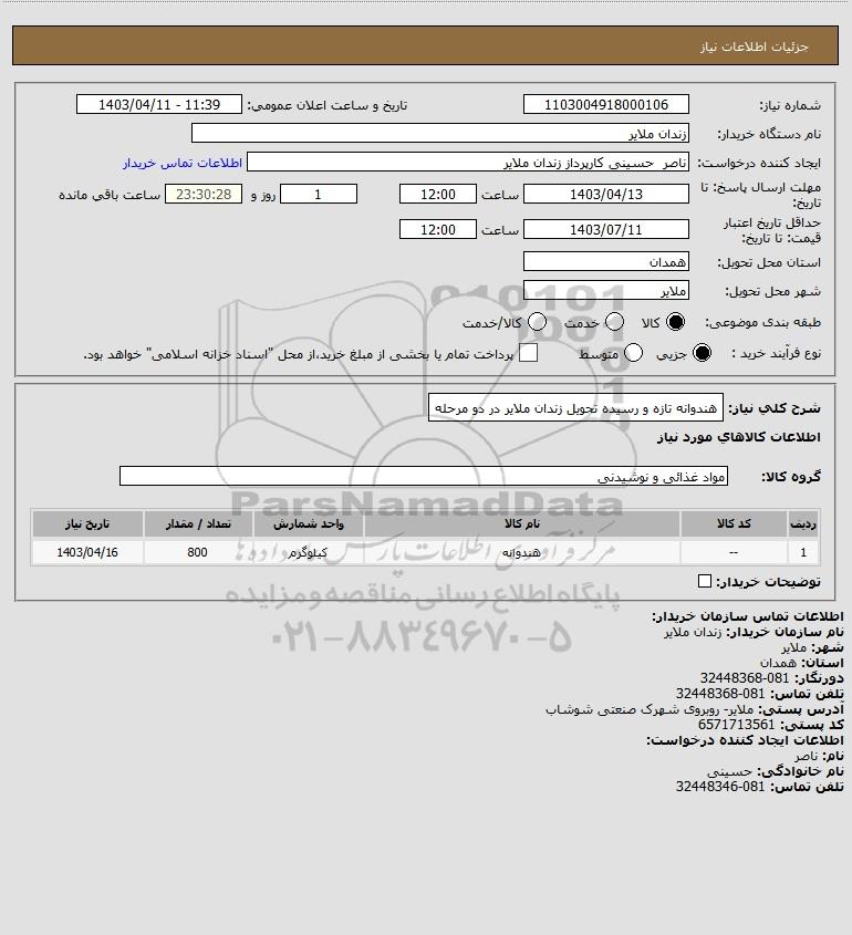 شرح کلی نیاز: هندوانه تازه و رسیده تحویل زندان ملایر در دو مرحله