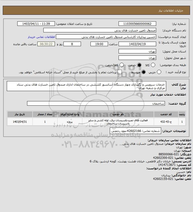 استعلام خدمات سرویس و نگهداری چهار دستگاه آسانسور کششی در ساختمان اداری صندوق تامین خسارت های بدنی ستاد مرکزی و شعبه تهران, استعلام خدمات سرویس و نگهداری چهار دستگاه آسانسور کششی در ساختمان اداری صندوق تامین خسارت های بدنی ستاد مرکزی و شعبه تهران