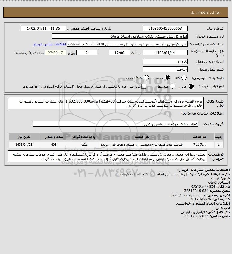 شرح کلی نیاز: پروژه نقشه برداری روستاهای (پیوست)شهرستان جیرفت(408هکتار) برآورد1.632.000.000 ریال.اعتبارات استانی.کسورات قانونی طرح.مستندات بپیوست.مدت قرارداد 14 روز