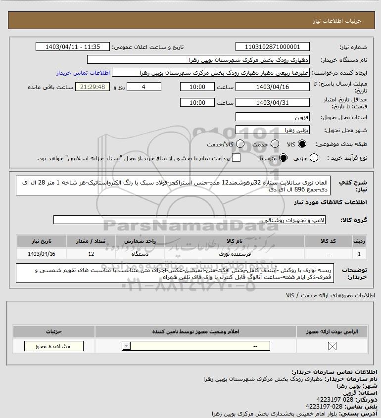 استعلام بها و موضوع استعلام استعلام المان نوری سانلایت ستاره 32پرهوشمند12 عدد-جنس استراکچر-فولاد سبک با رنگ الکترواستاتیک-هر شاخه 1 متر 28 ال ای دی-جمع 896 ال ای دی به اطلاع کلیه شرکت‌ها و افراد متخصص واجد شرایط می‌رساند، آگهی گذار در نظر دارد از طریق استعلام بها، نسبت به انتخاب و دریافت پیشنهادات اقدام نماید. این استعلام با کد آگهی ثبت شده در سامانه خبرگزاری پارس نماد : 7671662 منتشر شده است. مشخصات استعلام : تاریخ شروع استعلام: 1403/04/11 آخرین مهلت ارسال پیشنهاد قیمت : 1403/04/16 و محل اجرای پروژه : استان قزوین میباشد. استعلام قیمت مورد درخواست : استعلام المان نوری سانلایت ستاره 32پرهوشمند12 عدد-جنس استراکچر-فولاد سبک با رنگ الکترواستاتیک-هر شاخه 1 متر 28 ال ای دی-جمع 896 ال ای دی با دسته‌بندی‌های تخصصی و گروه های مرتبط : صنایع روشنایی, تجهیزات پارک و مبلمان شهری, نورپردازی, تجهیزات برق و الکترونیک, استعلام اطلاع رسانی میگردد.