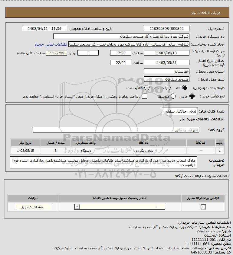 اسناد مناقصه استعلام ترولی جرثقیل سقفی به علت اتمام مهلت شرکت در مناقصه از روی وب سایت برداشته شده است. برای رویت اسناد جدید به صفحه اسناد مناقصه مزایده مراجعه کنید.