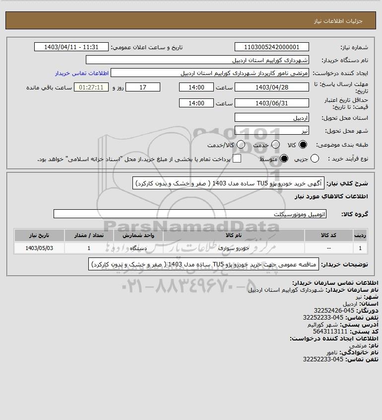 توضیحات خریدار: مناقصه عمومی جهت خرید خودرو پژو TU5 ساده مدل 1403 ( صفر و خشک و بدون کارکرد)