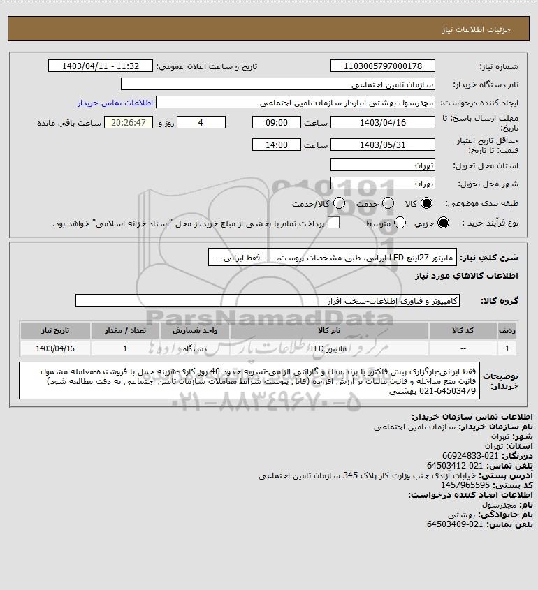 شرح کلی نیاز: مانیتور 27اینچ LED ایرانی، طبق مشخصات پیوست، ---- فقط ایرانی ---