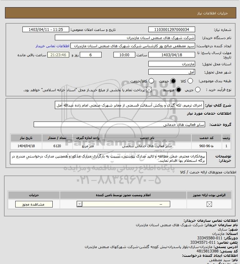 شرح کلی نیاز: اجرای ترمیم، لکه گیری و روکش آسفالت قسمتی از معابر شهرک صنعتی امام زاده عبدالله آمل