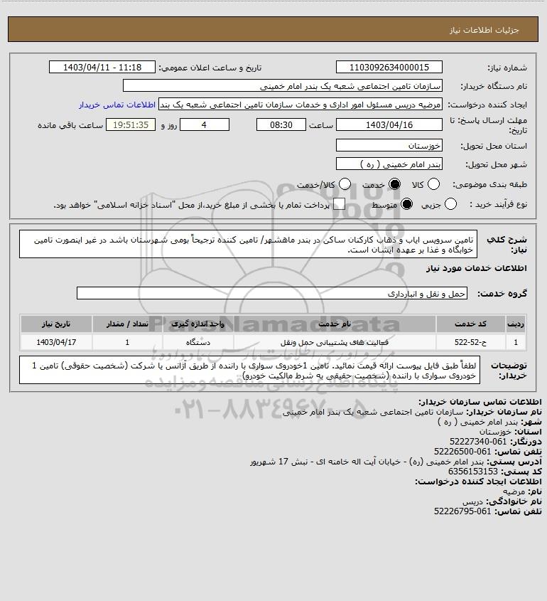 شرح کلی نیاز: تامین سرویس ایاب و ذهاب کارکنان ساکن در بندر ماهشهر/ تامین کننده ترجیحاً بومی شهرستان باشد در غیر اینصورت تامین خوابگاه و غذا بر عهده ایشان است.