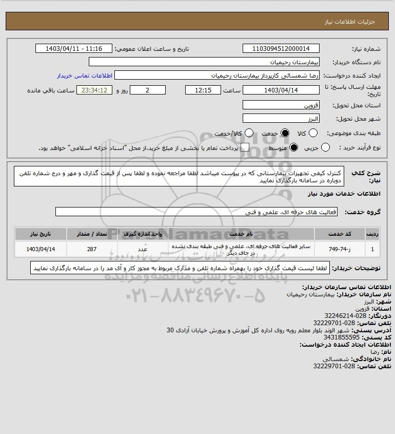 شرح کلی نیاز: کنترل کیفی تجهیزات بیمارستانی که در پیوست میباشد لطفا مراجعه نموده و لطفا پس از قیمت گذاری و مهر و درج شماره تلفن دوباره در سامانه بارگذاری نمایید