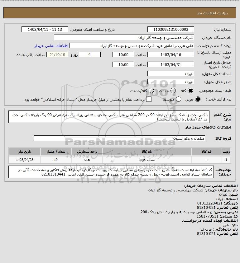 استعلام بها و موضوع استعلام استعلام باکس تخت و تشک اتاقها در ابعاد 90 در 200 سانتی متر -باکس تختخواب هتلی رویال یک نفره عرض 90 رنگ پارچه باکس تخت کد 27 (مطابق با لیست پیوست) به اطلاع کلیه شرکتها و افراد متخصص واجد شرایط میرساند، آگهی گذار در نظر دارد از طریق استعلام بها، نسبت به انتخاب و دریافت پیشنهادات اقدام نماید. این استعلام با کد آگهی ثبت شده در سامانه خبرگزاری پارس نماد : 7671863 منتشر شده است. مشخصات استعلام : تاریخ شروع استعلام: 1403/04/11 آخرین مهلت ارسال پیشنهاد قیمت : 1403/04/16 و محل اجرای پروژه : استان تهران میباشد. استعلام قیمت مورد درخواست : استعلام باکس تخت و تشک اتاقها در ابعاد 90 در 200 سانتی متر -باکس تختخواب هتلی رویال یک نفره عرض 90 رنگ پارچه باکس تخت کد 27 (مطابق با لیست پیوست) با دستهبندیهای تخصصی و گروه های مرتبط : البسه و پوشاک, استعلام اطلاع رسانی میگردد.