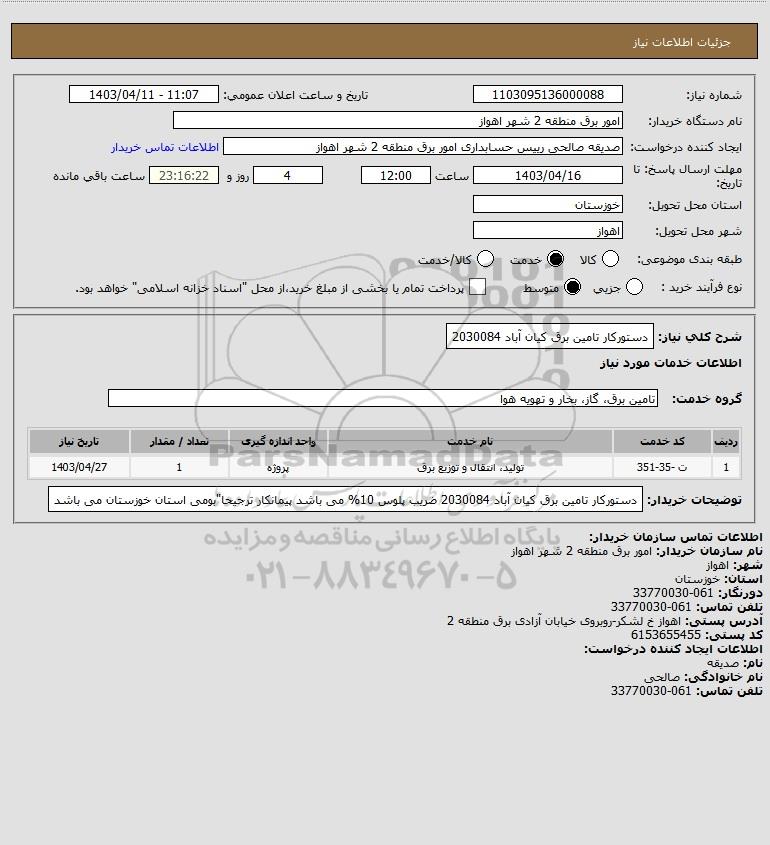 شرح کلی نیاز: دستورکار تامین برق کیان آباد 2030084