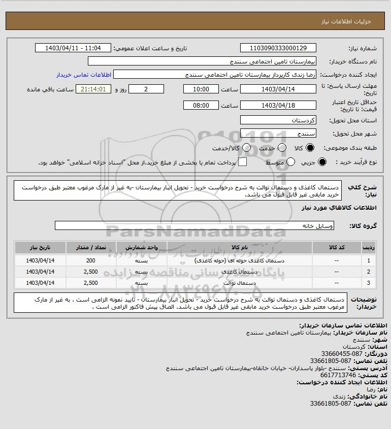| 2 | -- | دستمال کاغذی | بسته | 2,500 | 1403/04/14 |