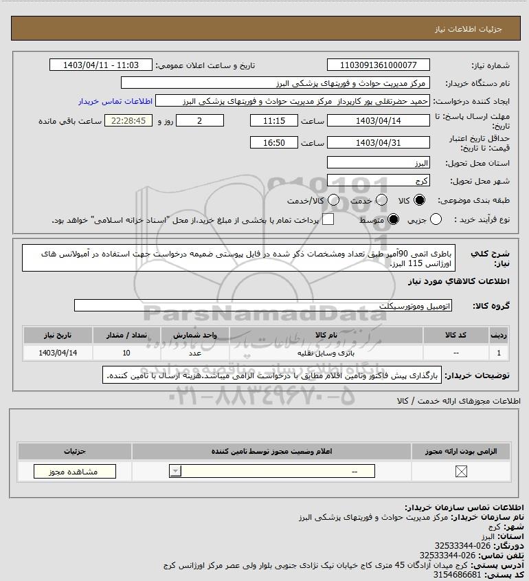 شرح کلی نیاز: باطری اتمی 90آمپر طبق تعداد ومشخصات ذکر شده در فایل پیوستی ضمیمه درخواست جهت استفاده در آمبولانس های اورژانس 115 البرز.