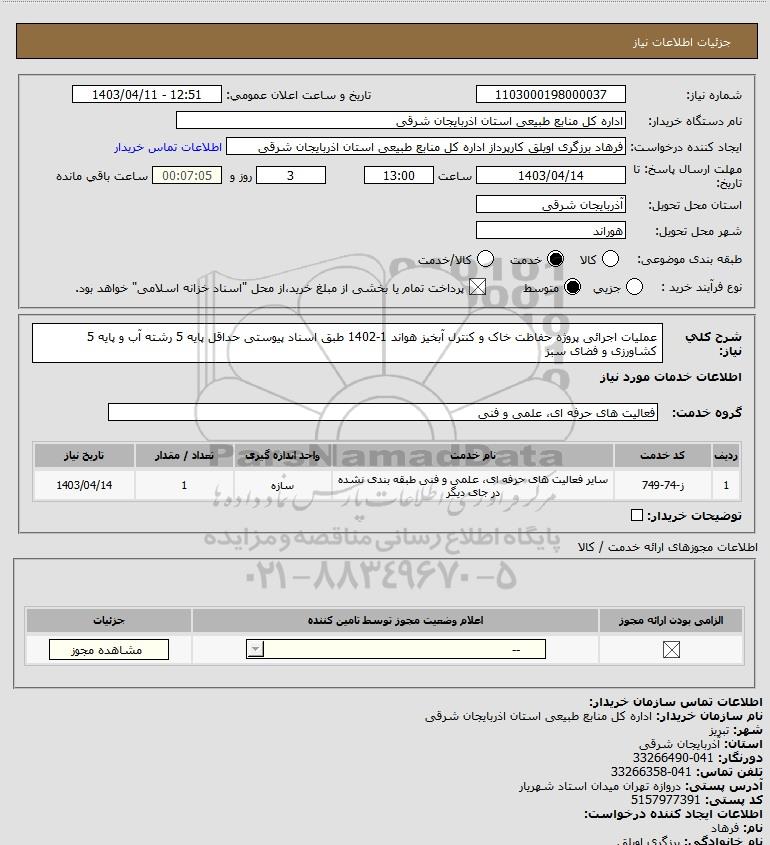 شرح کلی نیاز: عملیات اجرائی پروژه حفاظت خاک و کنترل آبخیز هواند 1-1402 طبق اسناد پیوستی حداقل پایه 5 رشته آب و پایه 5 کشاورزی و فضای سبز