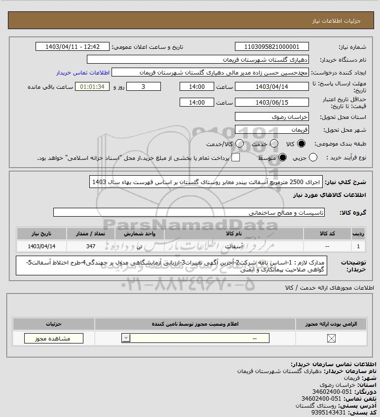 شرح کلی نیاز: اجرای 2500 مترمربع آسفالت بیندر معابر روستای گلستان بر اساس فهرست بهاء سال 1403