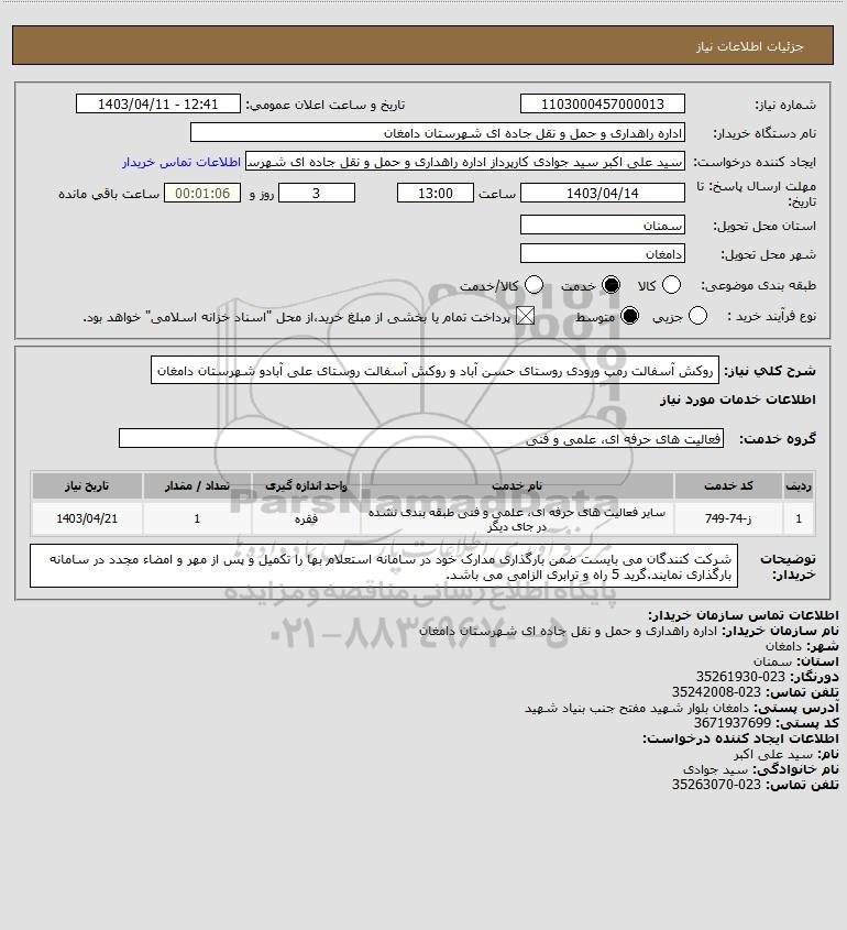 شرح کلی نیاز: روکش آسفالت رمپ ورودی روستای حسن آباد و روکش آسفالت روستای علی آبادو شهرستان دامغان