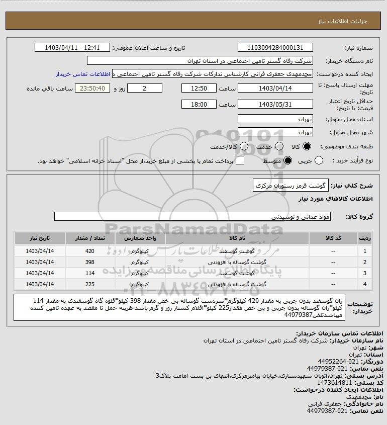 شرح کلی نیاز: گوشت قرمز رستوران مرکزی