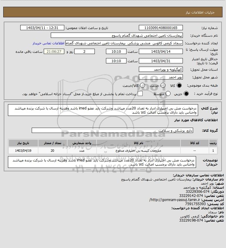 نام دستگاه خریدار:بیمارستان تامین اجتماعی شهدای گمنام یاسوج