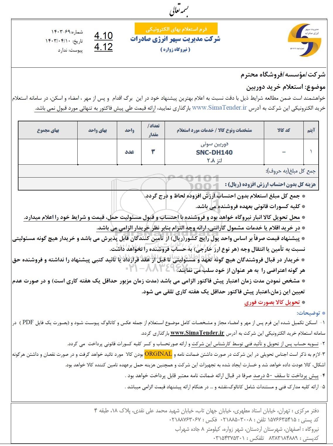 خواهشمند است ضمن مطالعه شرایط ذیل با دقت نسبت به اعلام بهترین پیشنهاد خود در این برگ اقدام و پس از مهر امضا اسکن در سامانه استعلام خرید الکترونیکی به آدرس WWW.SIMATENDER.IR بارگذاری نمایید ارایه قیمت طی پیش فاکتور به تنهایی مورد قبول نمی باشد.