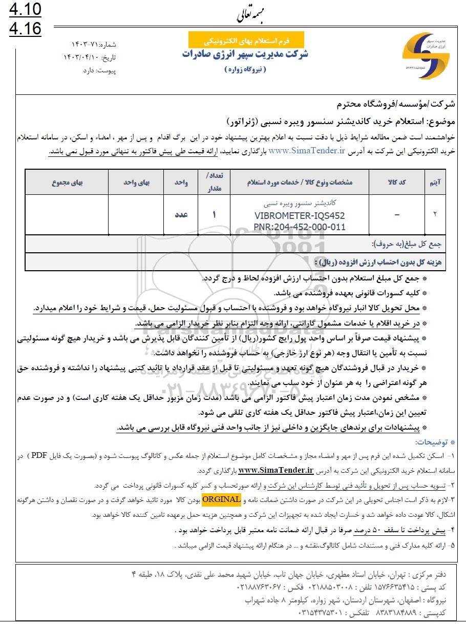 خواهشمند است ضمن مطالعه شرایط ذیل با دقت نسبت به اعلام بهترین پیشنهاد خود در این برگه اقدام و پس از مهر امضا اسکن در سامانه استعلام خرید الکترونیکی این شرکت به آدرس WWW.SIMATENDER.IR بارگذاری نمایید.