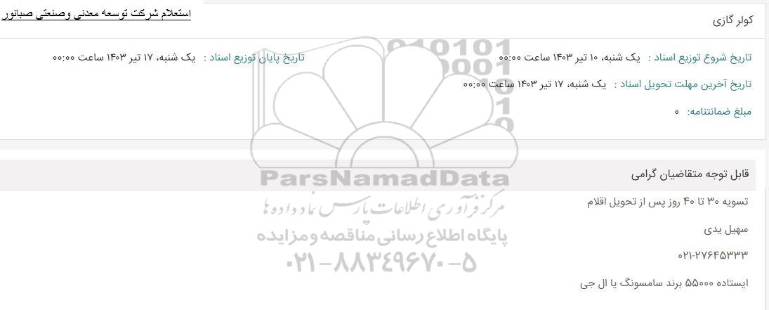 استعلام بها و موضوع استعلام استعلام کولر گازی به اطلاع کلیه شرکتها و افراد متخصص واجد شرایط میرساند، آگهی گذار در نظر دارد از طریق استعلام بها، نسبت به انتخاب و دریافت پیشنهادات اقدام نماید. این استعلام با کد آگهی ثبت شده در سامانه خبرگزاری پارس نماد : 7672166 منتشر شده است. مشخصات استعلام : تاریخ شروع استعلام: 1403/04/11 آخرین مهلت ارسال پیشنهاد قیمت : 1403/04/17 و محل اجرای پروژه : استان سایر میباشد. استعلام قیمت مورد درخواست : استعلام کولر گازی با دستهبندیهای تخصصی و گروه های مرتبط : تاسیسات ساختمانی, صنایع حرارتی و برودتی, لوازم خانگی, استعلام اطلاع رسانی میگردد.