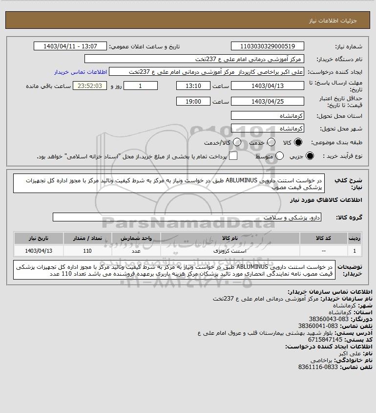 توضیحات خریدار:در خواست استنت دارویی ABLUMINUS طبق در خواست ونیاز به مرکز به شرط کیفیت وتائید مرکز با مجوز اداره کل تجهیزات پزشکی قیمت مصوب نامه نمایندگی انحصاری مورد تائید پزشکان مرکز هزینه باربری برعهده فروشنده می باشد تعداد 110 عدد