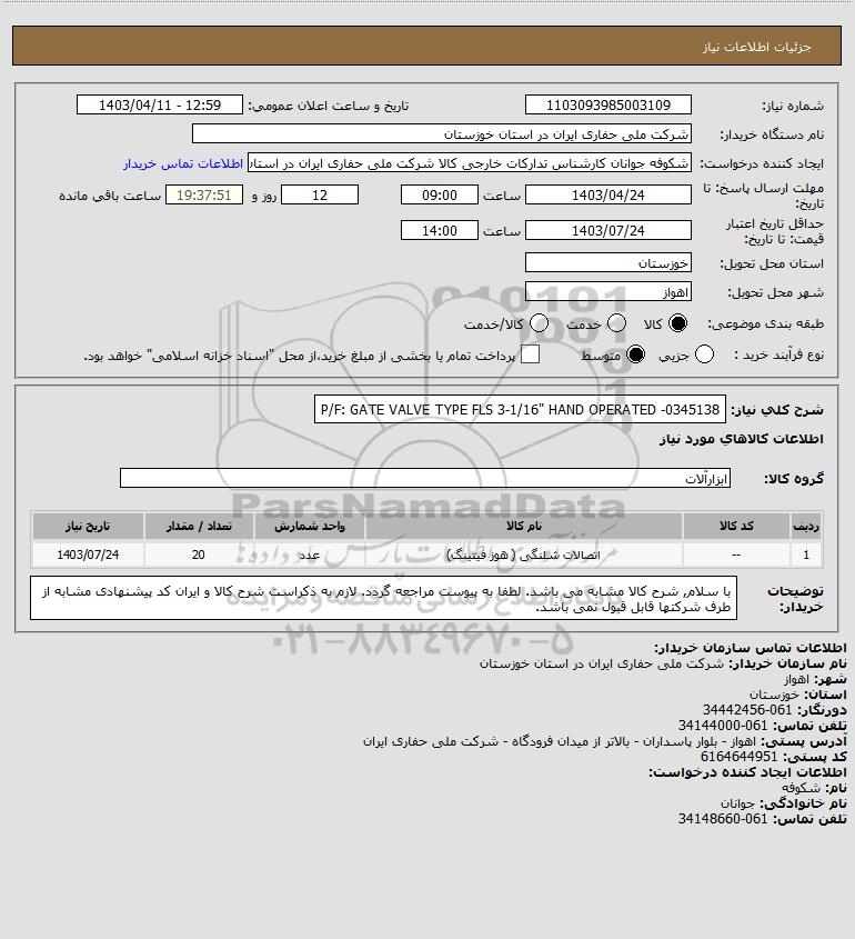 شرح کلی نیاز: P/F: GATE VALVE TYPE FLS 3-1/16" HAND OPERATED -0345138