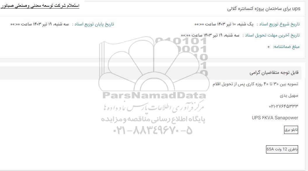 استعلام UPS برای ساختمان پروژه کنسانتره گلالی, استعلام UPS برای ساختمان پروژه کنسانتره گلالی