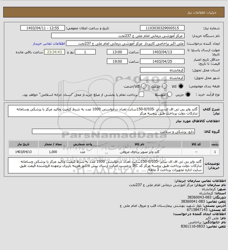 شرح کلی نیاز: گاید وایر پی تی اف ای سایز -0/035-150سانت تعداد درخواستی 1000 عدد به شرط کیفیت وتائید مرکز با پزشکی وسامانه تدارکات دولت پرداخت طبق پروسه مرکز