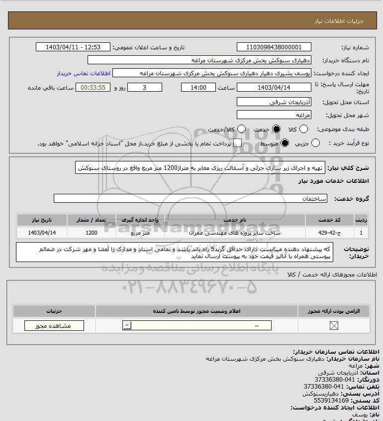 شرح کلی نیاز: تهیه و اجرای زیر سازی جزئی و آسفالت ریزی معابر به متراژ1200 متر مربع واقع در روستای سنوکش
