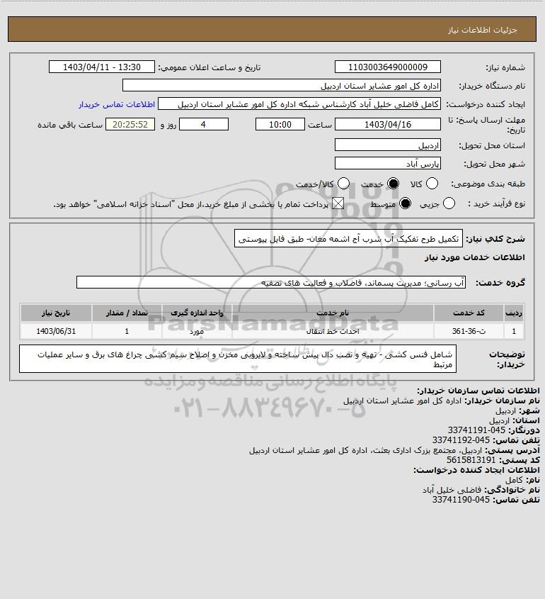 شرح کلی نیاز: تکمیل طرح تفکیک آب شرب آج اشمه مغان- طبق فایل پیوستی