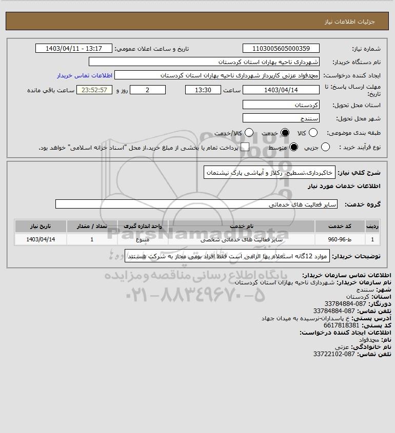 شرح کلی نیاز: خاکبرداری،تسطیح، رکلاژ و آبپاشی پارک نیشتمان
