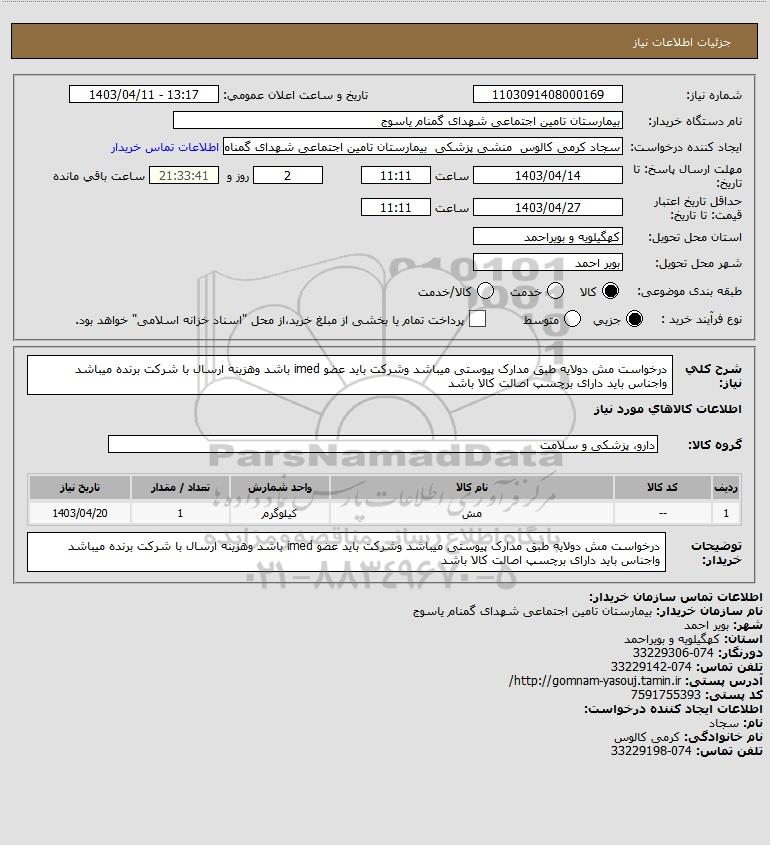 نام دستگاه خریدار:بیمارستان تامین اجتماعی شهدای گمنام یاسوج