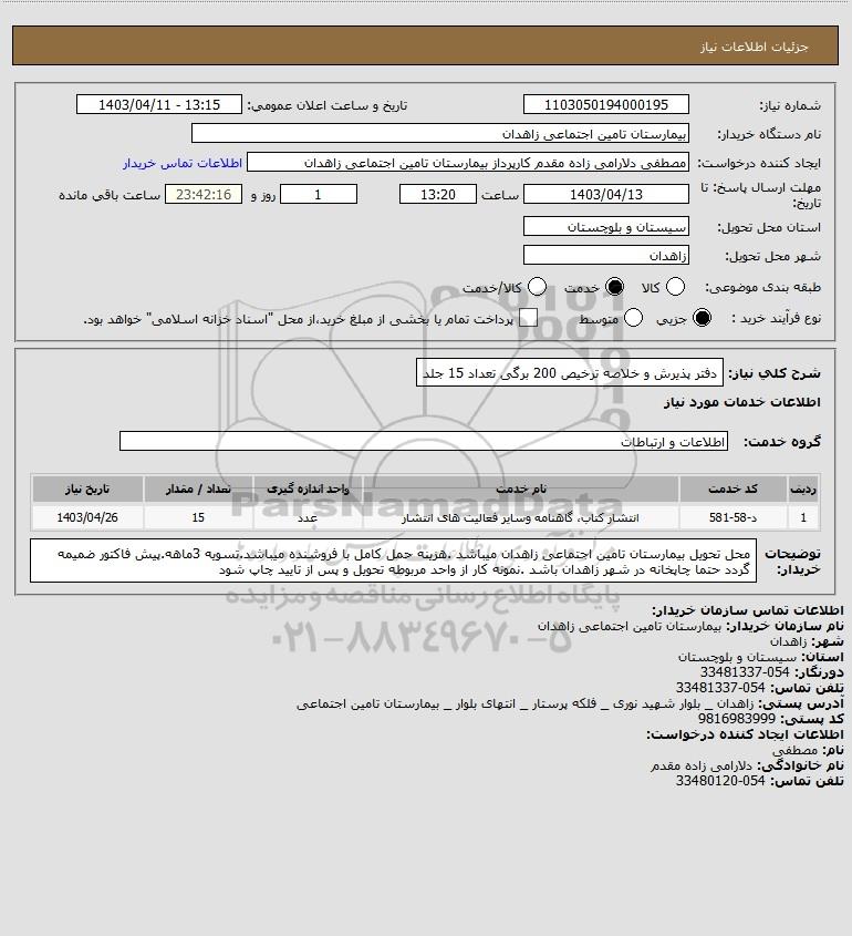 شرح کلی نیاز: دفتر پذیرش و خلاصه ترخیص 200 برگی تعداد 15 جلد