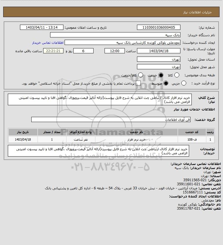 شرح کلی نیاز: خرید نرم افزار کانال ارتباطی چت انلاین به شرح فایل پیوست(ارائه آنالیز قیمت،پروپوزال ،گواهی افتا و تایید پیسوت امنیتی الزامی می باشد)